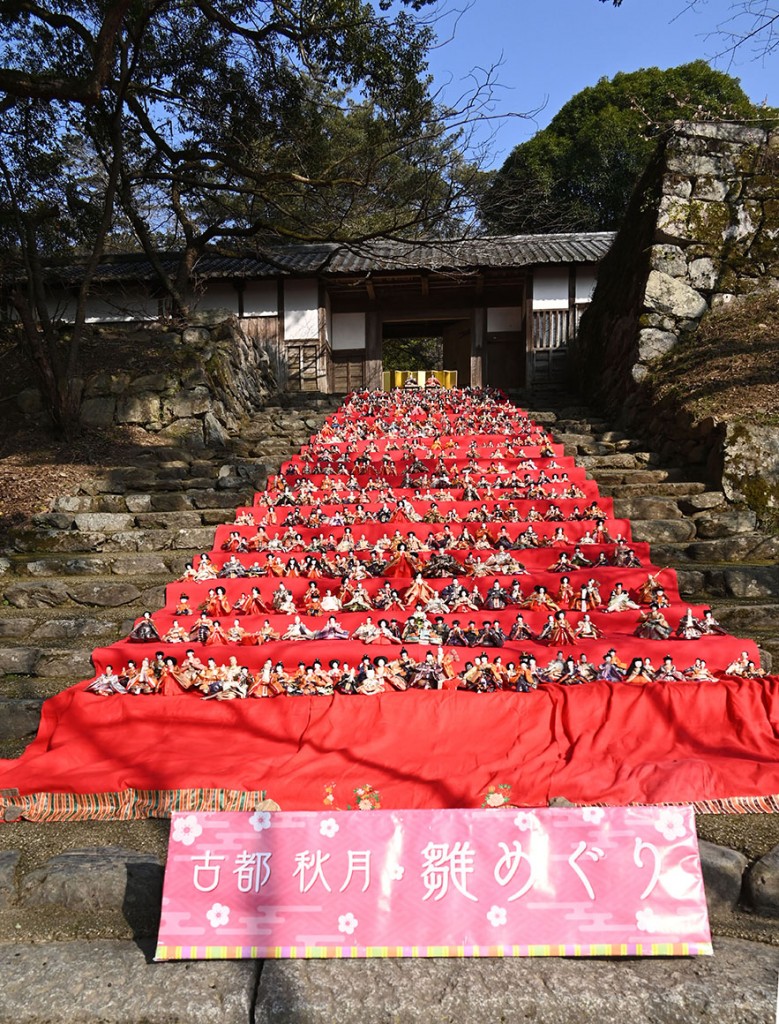 休日を利用して秋月に行ってきました。長屋門前の石段に600体のひな人形。