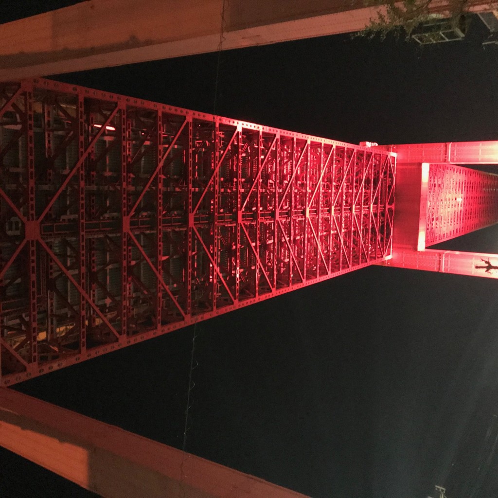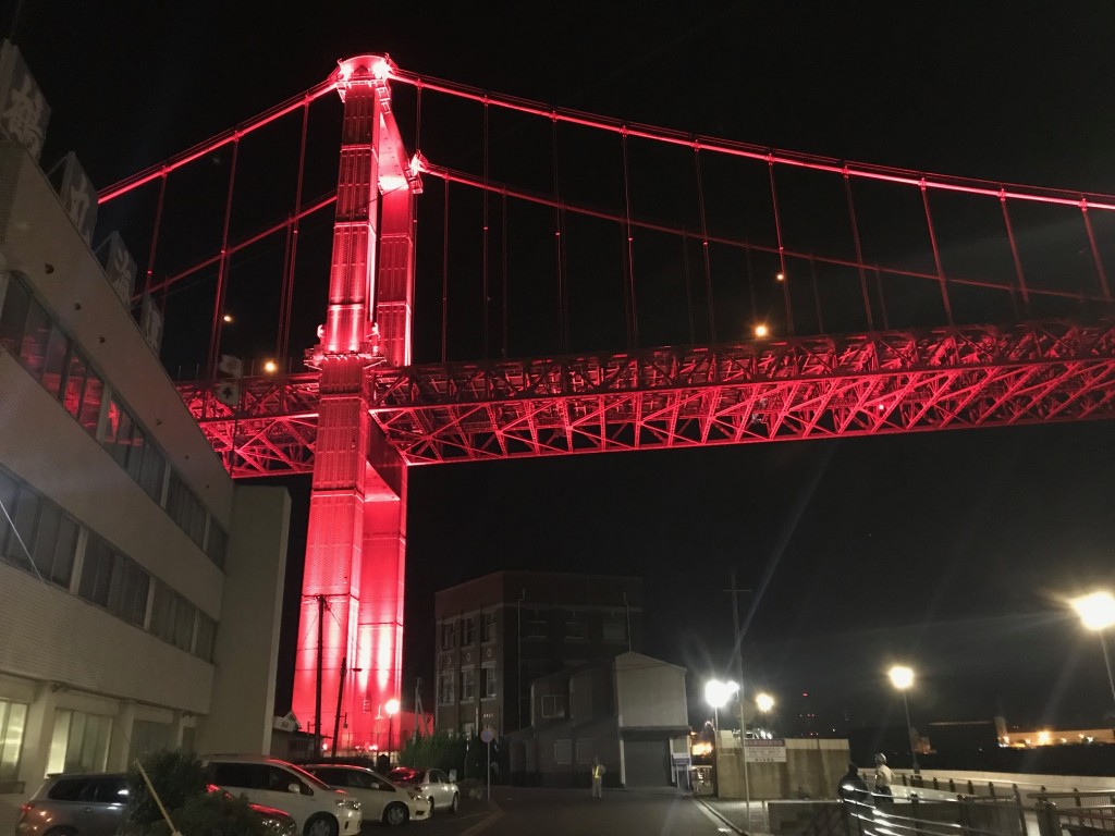 12月1日より無料化されます。それに合わせて夜間ライトアップが計画されているそうですが、今夜は照明のテストをされていました。赤い橋が見事に浮かび上がってました。